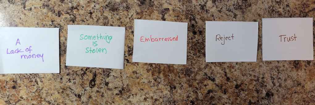 To help in choosing the words for each group, use verbs for the Action/Reaction cards, Adjectives for the Emotion cards, Sentences for the Event Cards, and a noun or noun-plus-adjective for the Problem cards.